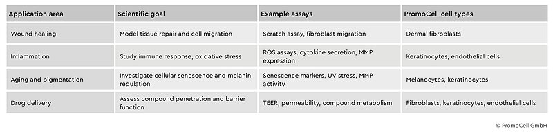 Table 1: Key application areas in dermatology drug discovery using primary human skin cells. Summary of how primary human skin cells and tissue models support diverse applications in dermatological research and drug development.